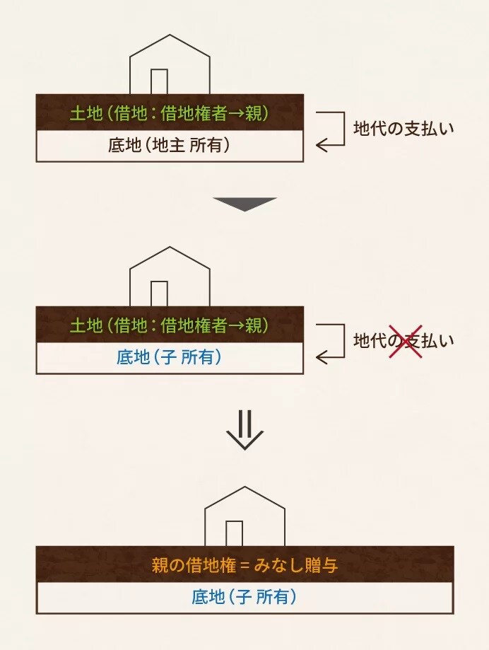 たとえば地主に地代の支払いを行っていた親(借地権者)の子供が地主から底地を取得し、その後親子間での地代の支払いをしないこととした場合には、借地権者である親から子供に借地権の贈与があったものとみなされて課税が行われます。