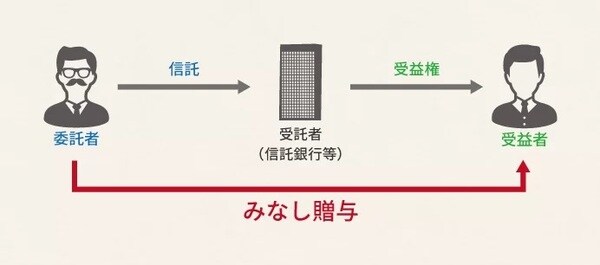 財産を信託した場合、受益者=委託者であれば受益権に係る経済的利益は委託者の所得税の対象となりますが、受益者が委託者と異なる第三者である場合には、委託者から受益者に対し間接的に贈与があったものとみなして課税が行われます。