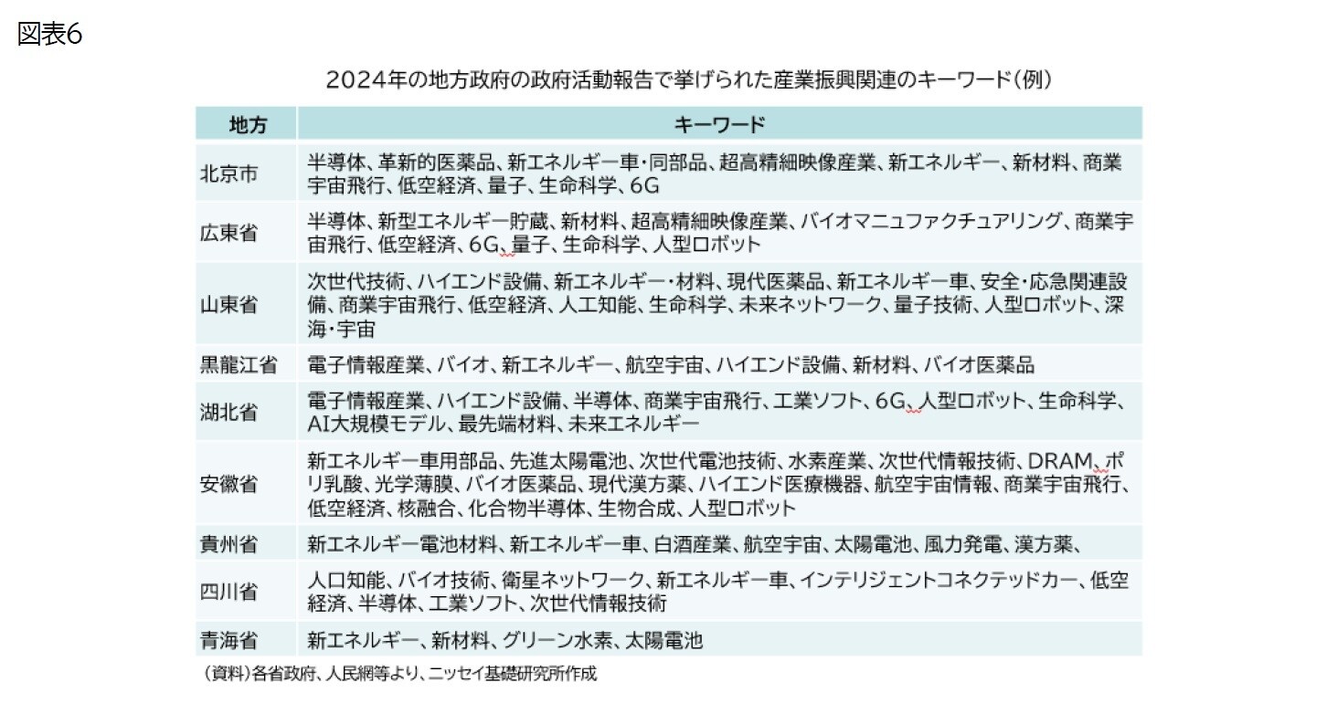 具体的な産業や技術等についてもまだ具体化されているわけではないが、24年3月に開催された全国人民代表大会における政府活動報告では、「戦略性新興産業」として、新エネルギー車や新興水素、新材料、革新的医薬品、バイオマニュファクチャリング、商業宇宙飛行、低空経済、また、「未来産業」として、量子や生命科学といった産業や技術が挙げられている(図表5)。これらの多くは、21年に発表された第14次五カ年計画で既に列挙されていたが、「新質生産力」発展のスローガンを契機に、産業支援の機運が高まる可能性が高い。政府系ファンドによる投資や補助金支給などを通じ、技術開発の強化やサプライチェーンの構築、市場の創出など様々な策が講じられるだろう。また、24年の各地方政府における政府活動報告では、上述のような産業の育成を強化する考えが示されており(図表6)、地方間での競争が激しくなることも予想される。その過程では、非効率な生産能力の拡張など様々な歪が生じるかもしれないが、着実に生産力が向上する可能性がある。