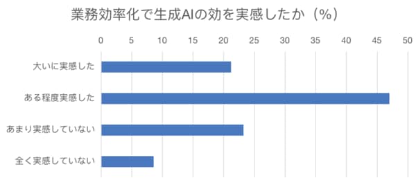 実際に活用している人に「生成AIで作業効率の向上を実感したか」と聞いたところ、「大いに実感している」と回答した人は21.2%だった。「実感している」とした人も47%で、実感している人の合計は68.2%にのぼった。生成AIを使ってみたいとした人に「具体的にどのような業務での効果を期待するか」と質問したところ、「文書のチェック」が60.4%でトップ(複数回答)。「文書の要約」が54.9%で続いた。