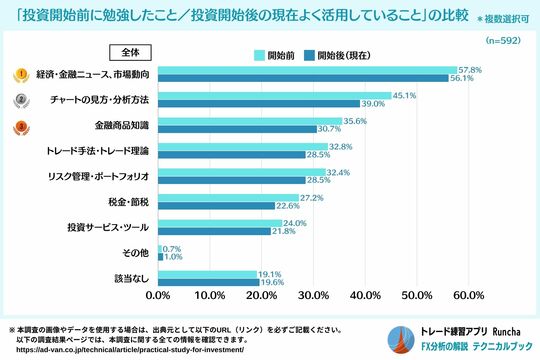 これに続くのが「チャートの見方・分析方法」で、開始前45.1%/開始後39.0%となりました。3位以下との差は大きく、投資においてチャート分析が重視されていることが分かります。ただし、減少幅が6.1%と最も大きくなっており、投資方法によっては勉強してもうまく活用できないこともあるようです。