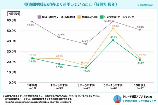 続いて、投資開始後に活用していることの上位3位をピックアップして、投資の経験年数別に集計したグラフです。