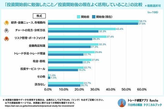 2位は「チャートの見方・分析方法」で開始前43.4%/開始後32.3%、3位は「リスク管理・ポートフォリオ」で開始前37.4%/開始後28.3%となっています。株式ではチャート分析やリスク管理が重視されるものの、減少幅が11.1%/9.1%と大きく、うまく活用できていない人が多いようです。