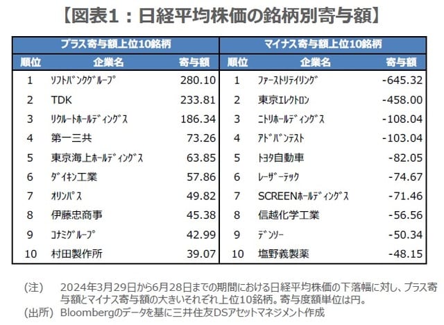 日経平均は4-6月期に約786円下げたがプラス寄与額上位3銘柄で約700円押し上げた計算