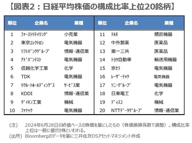 このように、4-6月期の日経平均の動きは、プラス寄与額上位3銘柄とマイナス寄与額上位5銘柄で、大方説明が可能と思われます。これらの銘柄の多くは、いずれも1単元(売買単位)あたりの株価が高い、いわゆる「値がさ株」ですが(図表2)、日経平均は、構成銘柄の平均値によって算出(厳密には構成銘柄の株価を株価換算係数で調整した上で合計し、除数で割って算出)されるため、値がさ株の影響を大きく受ける傾向があります。