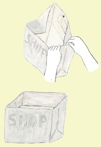 丈夫な紙袋は、小物の仕分けに便利な収納グッズに。まず、使う場所の高さに合わせ、紙袋の上部に折り目をつけます。手さげ部分を切り取り、折り目部分で内側に折り込めば完成。