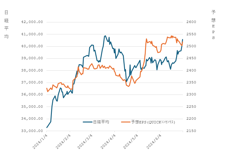 ただ、アナリストは引き続き今期も増益を見込んでいたため、QUICKコンセンサスベースの利益予想はゴールデンウイーク明けには上振れし、日経平均の予想EPSで2,500円を超える水準となっていた。TOPIXの予想EPSはより安定的に推移し、180ポイントを超えている。足元の株高の要因は、第一に、出遅れていた業績期待の織り込みが進んで、やっとアナリスト・コンセンサスにサヤ寄せしてきたということだろう。