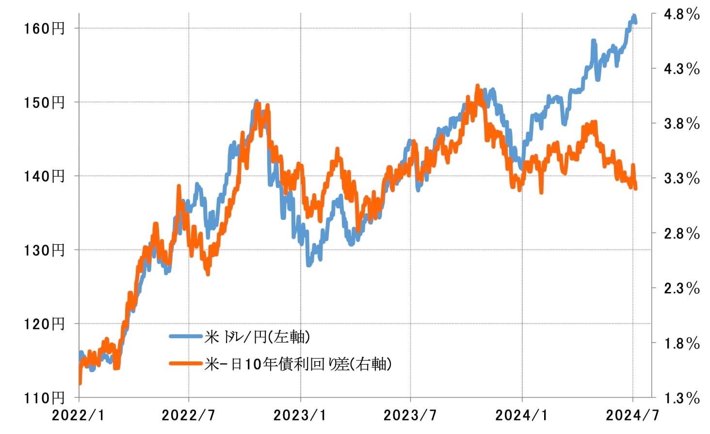 2022年の場合は、インフレ対策の米利上げが3月から始まり、その後本格化しました。このため、米金利の上昇に伴う日米金利差の「米ドル優位・円劣位」の拡大も、7月にかけて続きました。