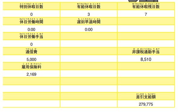 働いた時間や休んだ時間、残業時間などが書かれています。