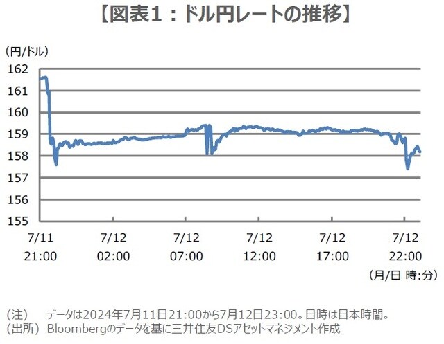 ドル円は7月11日午後9時半(日本時間、以下同じ)に6月の米消費者物価指数(CPI)が発表された後、急速にドル安・円高に振れ、1ドル=157円44銭水準をつけました(図表1)。CPIが市場予想を下回ったことに反応した部分もあると思われますが、CPI発表後、30分ほどで4円強もドル安・円高が進んだことから、市場では政府・日銀がドル売り・円買いの為替介入に踏み切ったのではないかとの見方が広がりました。