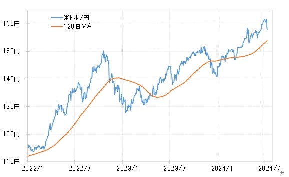 ところで、代表的な投機筋であるヘッジファンドの場合、テクニカルには、過去半年の平均値である26週MA(移動平均線)や120日MAが、売買転換点の目安となっていると考えられます。ということは、120日MAなどを米ドル/円が大きく割れる場合には、米ドル買い・円売りポジションの損益確定が、本格化する可能性があります。ちなみに、足元の120日MAは、153.9円程度です(図表5参照)。