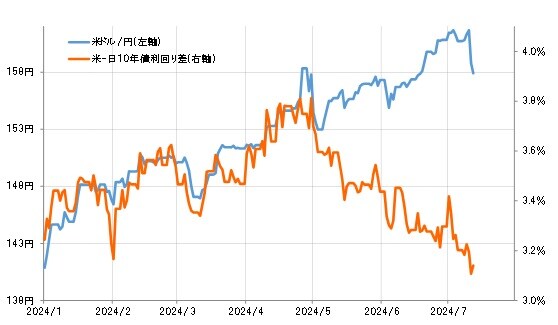 7月に入って発表された米経済指標は、ISM(米供給管理協会)の製造業および非製造業の景気指数、雇用統計など予想より弱い結果が目立ち、米景気の減速との受け止め方が広がりました。それに加えて、先週11日に発表された米6月CPI(消費者物価指数)が予想より弱い結果だったことから、インフレへの懸念も一段と後退し、早ければ、9月に最初の利下げの可能性も浮上しており、早期利下げへの期待が広がってきました。