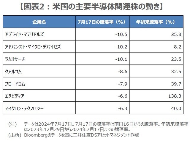 なお、7月17日の米国株式市場でも、半導体関連株に売りが波及し、エヌビディアやアドバンスト・マイクロ・デバイス(AMD)などが軒並み下落しました(図表2)。また、マイクロソフトやアップルなど大型ハイテク7銘柄の「マグニフィセントセブン」も総崩れとなりました。市場では、米大統領選挙でトランプ前大統領の再選確率が高まったとの見方が強まっており、対中強硬策は続くとの警戒が影響していると推測されます。