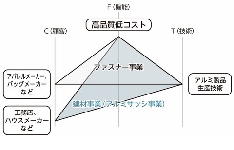 それを支えるT(技術)は、アルミ製品の生産技術になります。C(顧客)を見ると、ファスナー事業のC(顧客)はアパレルメーカーやバッグメーカー。一方、アルミサッシ事業のC(顧客)は工務店やハウスメーカーであり、従来のファスナー事業の顧客とは異なります。