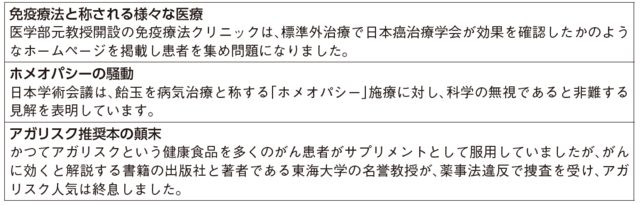 がん患者は、様々な不安を抱えています。そして、藁にも縋る思いで様々な療法に手を出します。このような患者の不安に付け込み標準外の怪治療とも言うべき医療が横行していますが、自由診療のために実態の把握や、医師法、薬事法などを除くと医療の監視が行き届かないために健康被害も防止できない状況です(図表3)。