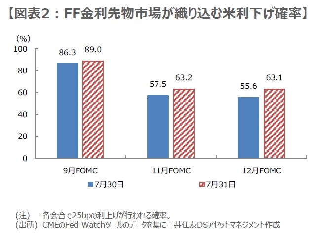 FOMCの結果を受け、米長期金利は低下、米ドルは対主要通貨でほぼ全面安、米主要株価指数は上昇で反応し、FF金利先物市場では、年内3回25bpずつ利下げが行われる確率が上昇しました(図表2)。米利下げが視野に入ったことで、この先、米長期金利は緩やかに低下し、米株を下支える展開が予想され、ドル円は、日銀の年内の追加利上げが意識されるなか、ドル高・円安局面からドル安・円高局面に移行した可能性が高いと思われます。