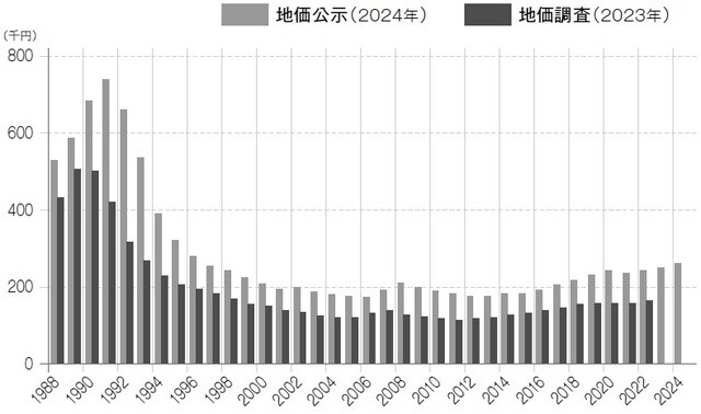 2024年の全国の地価動向では、全用途平均の地価は前年比2.3%上昇と、バブル期以来33年ぶりの高水準となりましたが、1990年代初頭の地価公示額と比較するとまだまだ足元にも及ばない状況にあります。