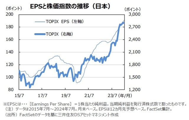 ●米ファクトセット(FactSet)によれば、日米の企業業績は過去最高水準を更新しており、好調を維持しています。7月末の米S&P500種指数の予想1株当たり純利益(EPS)は前年同月比+12.2%、TOPIXの予想EPSは同+18.7%と、いずれも2桁の伸びとなりました。