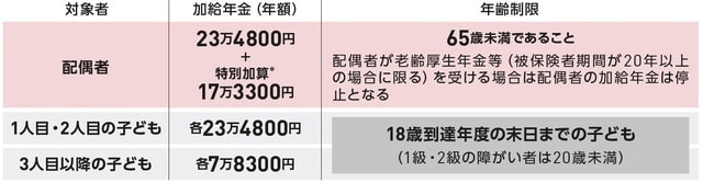 * 特別加算額は、老齢厚生年金を受けている人の生年月日によって異なる。1943年4月2日以降生まれは17万3300円