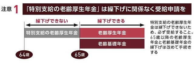 まず1つ目は、「特別支給の老齢厚生年金*」は、繰下げ対象外。これは、65歳までの有期年金となるため、繰下げできません。65歳以降にもらう年金の繰下げは改めて手続きできるため、特別支給分は受給した方がお得です。