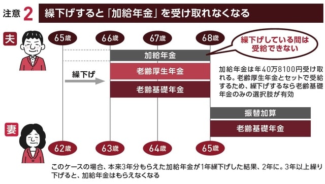 2つ目は、「加給年金」を受け取れる人が、繰下げをすると、繰下げ期間中は加給年金を受け取ることができません。そのため、配偶者が繰下げ期間中に65歳に達すると全額受け取り損ねることになります。加給年金は厚生年金の制度なので、繰下げ期間中に加給年金の受給権が発生する人は、老齢基礎年金のみを繰下げし、老齢厚生年金は繰下げせずに受給開始することで回避できます。