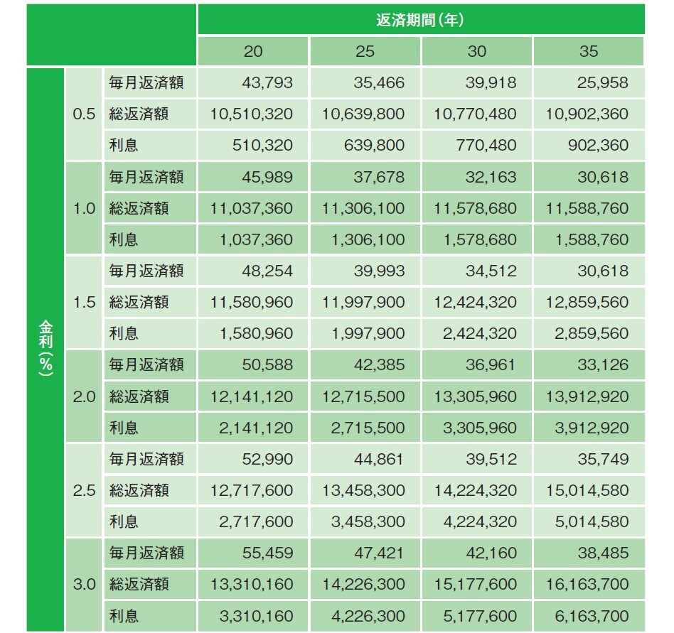住宅ローンは借金です。利息を上乗せして返済しなければなりません。1,000万円を35年返済で借りると、金利が0.5%でも約90万円ほどの利息を支払います。金利が1.5%だと約286万円もの利息負担です。借入金額が2,000万円なら2倍、3,000万円なら3倍の支払いになります[図表6]。