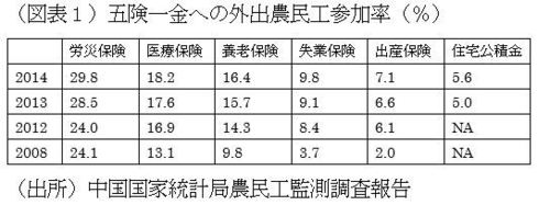 外出農民工の都市部での5険への参加率は、統計を取り始めた2008年以降、緩やかな上昇に止まっている(図表1)。大半は条件の悪い農村の保険か無保険の状態だ。改善が進まない背景として、以前から次のような理由が指摘されている。