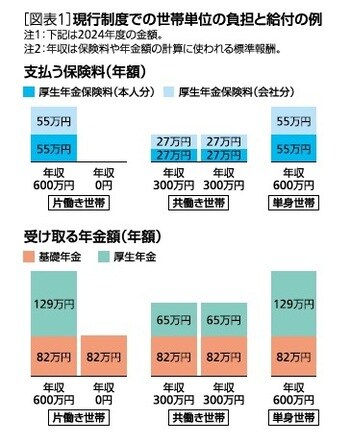 当制度に対しては、「専業主婦[夫]が保険料を納めないのは不公平だ」という批判をよく聞く。確かに、個人単位の「保険料を納めるか否か」に着目すれば、不公平に感じる。しかし、世帯単位の負担と給付の関係に視野を広げれば、世帯収入が同じ片働き世帯と共働き世帯の負担と給付は同じになっている[図表1]