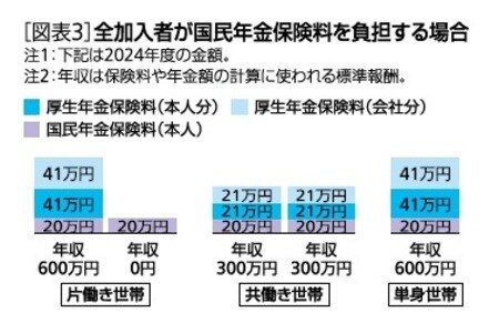 また、世帯間で負担を公平にするために全加入者が国民年金保険料を納める制度にすると、定額型である基礎年金の費用を報酬比例型の保険料でまかなうことによる、所得再分配効果が無くなる。そのため、収入が少ないほど現行制度よりも負担が大きくなる。例えば、図示した共働き世帯の片方(年収300万円)と年収600万円の単身世帯の負担の比を見ると、図表1や2では両者の収入に比例して1:2だが、図表3では定額部分があるため1:1.7になっている。
