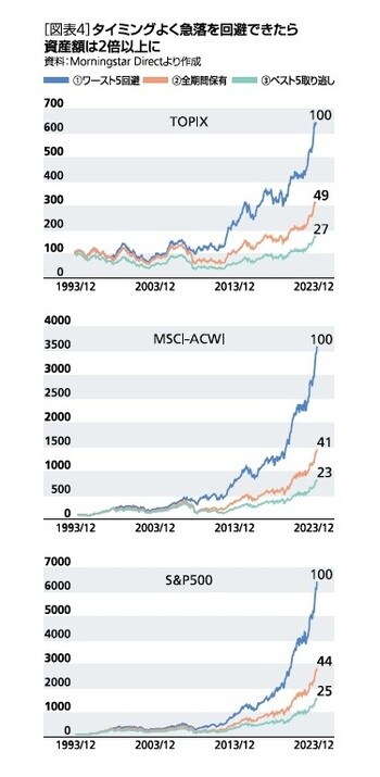 結果は図表4のとおりだ。TOPIXのケースでは、①急落を避けた場合の24年5月末時点の資産額を100とすると、②途中で現金化せず保有し続けた場合は49、③大相場を逃した場合は27にとどまった。