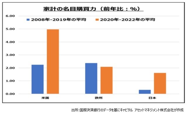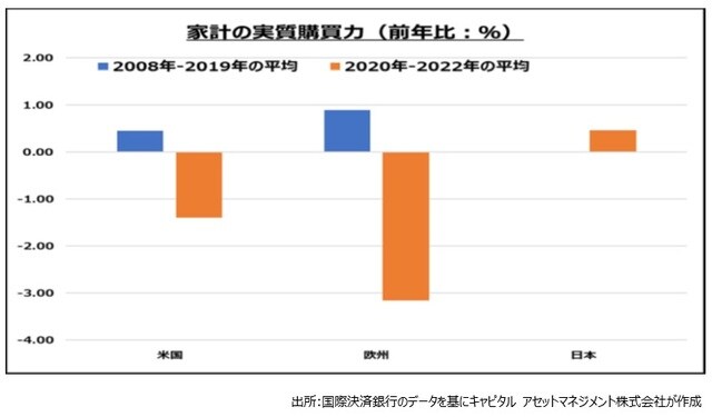 家計の目線で過去数年のインフレを振り返ると、実は結構厳しい状況でした。確かに賃金は上昇しており、直近2年の賃金上昇率(=名目購買力:2020-2022年の平均)は長期平均(2008-2019年の平均)を上回る国/地域が目立ちますが、同時に過去を上回る大幅なインフレが発生しており、賃金上昇率からインフレ率を差し引いた真水の購買力(=実質購買力)はかなり大きなマイナスへ陥っています(図表3、図表4)。したがって、家計(労働者)は大きな不満/不安を抱えているものと思われます。