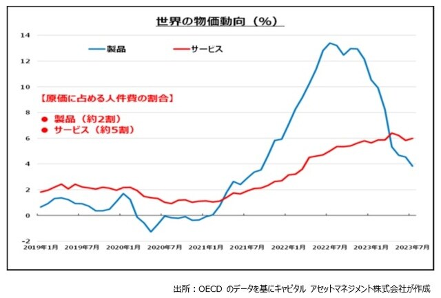 現在のところ、それは労働市場(の減速)と考えられています。世界全体の物価動向を俯瞰すると、製品価格(モノ)は順調に低下しているものの、サービス価格(娯楽/物流/飲食/医療等)が下げ渋る傾向を見せています(図表2)。