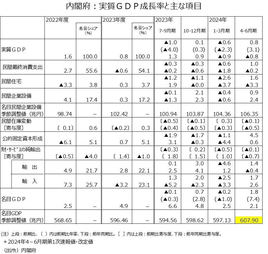 24年4~6月期GDP速報・第1次速報値が8月15日に公表された。実質GDP成長率は前期比+0.8%、前期比年率+3.1%と、2四半期ぶりのプラスとなりました。また、名目GDP成長率も前期比+1.8%、前期比年率+7.4%と、2四半期ぶりのプラスとなりました。