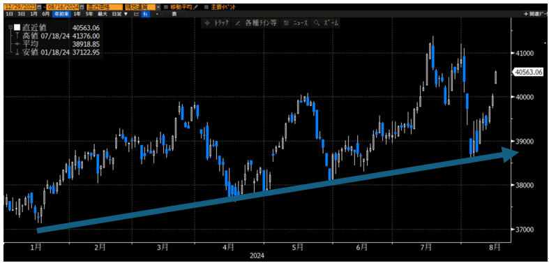 今後の展開として3万8,000円絡みのもみ合いに移行するのではないかと考える。少し日柄をかけて3万8,000円台を固めにいくだろう。これから相次ぐ重要イベント――ジャクソンホール、FOMC、自民党総裁選などに相場がどう反応していくかも非常に重要な点である。