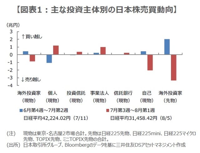 一般に、先物を取引する海外投資家には短期的な視点で売買を行う投機筋などが含まれるとされるため、投機筋による先物売りが、8月5日の日経平均の歴史的な急落の主因と考えられます。なお、日経平均が急速に上昇した6月第4週(6月24日~28日)から7月第2週(7月8日~12日)と、一気に失速した7月第3週(7月16日~19日)から8月第1週の、主な投資主体の売買動向は図表1の通りです。