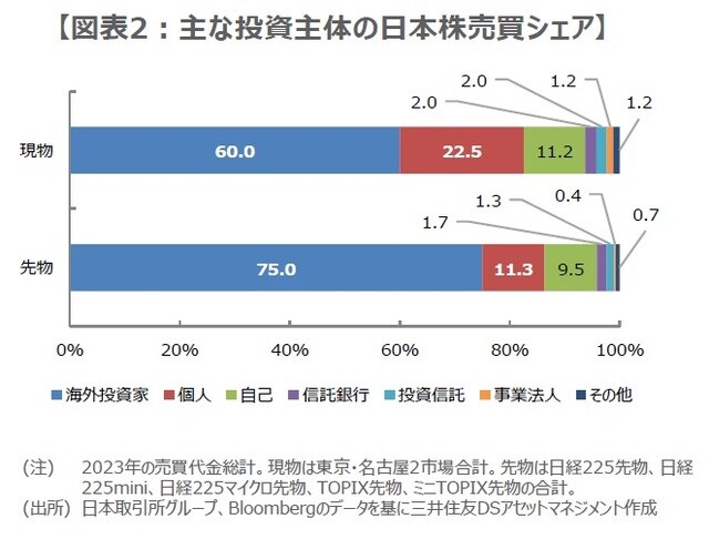 この期間、日経平均は終値ベースで7月11日に過去最高値をつけ、前述の通り、8月5日に過去最大の下げ幅、6日に過去最大の上げ幅を記録しましたが、図表1をみると、いずれも投機筋の先物主導である可能性が高いことが分かります。海外投資家の日本株の売買シェアは、現物で約60%、先物では約75%とかなり高く(図表2)、日本株は海外投資家の売買動向に強く影響を受ける傾向があります。