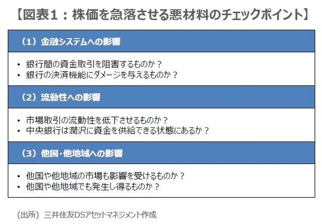 今回の株価急落の根底には、「米国景気の先行き不安」があると思われますが、市場で予期せぬ悪材料が発生し、株価が大きく下落した場合、まず確認すべきは次の3点です。すなわち、(1)金融システムへの影響、(2)流動性への影響、(3)他国・他地域への影響で(図表1)、いずれも影響がなければ、過度な警戒は不要と判断されます。そこで、今回のケースについて、この3点に影響するか否かを考えてみます。
