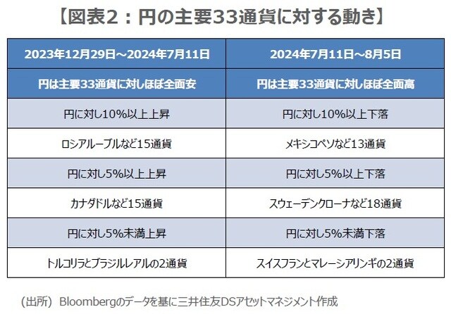 なお、円は主要通貨に対し、昨年末から7月11日まではほぼ全面安、7月11日から8月5日まではほぼ全面高となっており(図表2)、日本株の下落は大幅な円高進行が一因と考えられますが、この円高の進行に、円キャリー取引の解消が、どの程度占めたかを正確に知ることができません。ただ、ある程度の影響を勘案すれば、円キャリー取引は「間接的な株安要因」といえるように思われます。