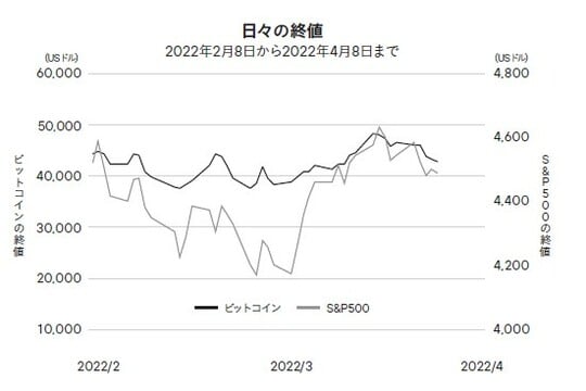 次の図表は、2022年2月8日から2022年4月8日までの各指標の日々の変動を視覚化したものである。この表によれば、ビットコインは3月16日に3万7023ドルの最安値を、3月30日に4万7078ドルの最高値を計上し、60日間の変動幅は21パーセントである。