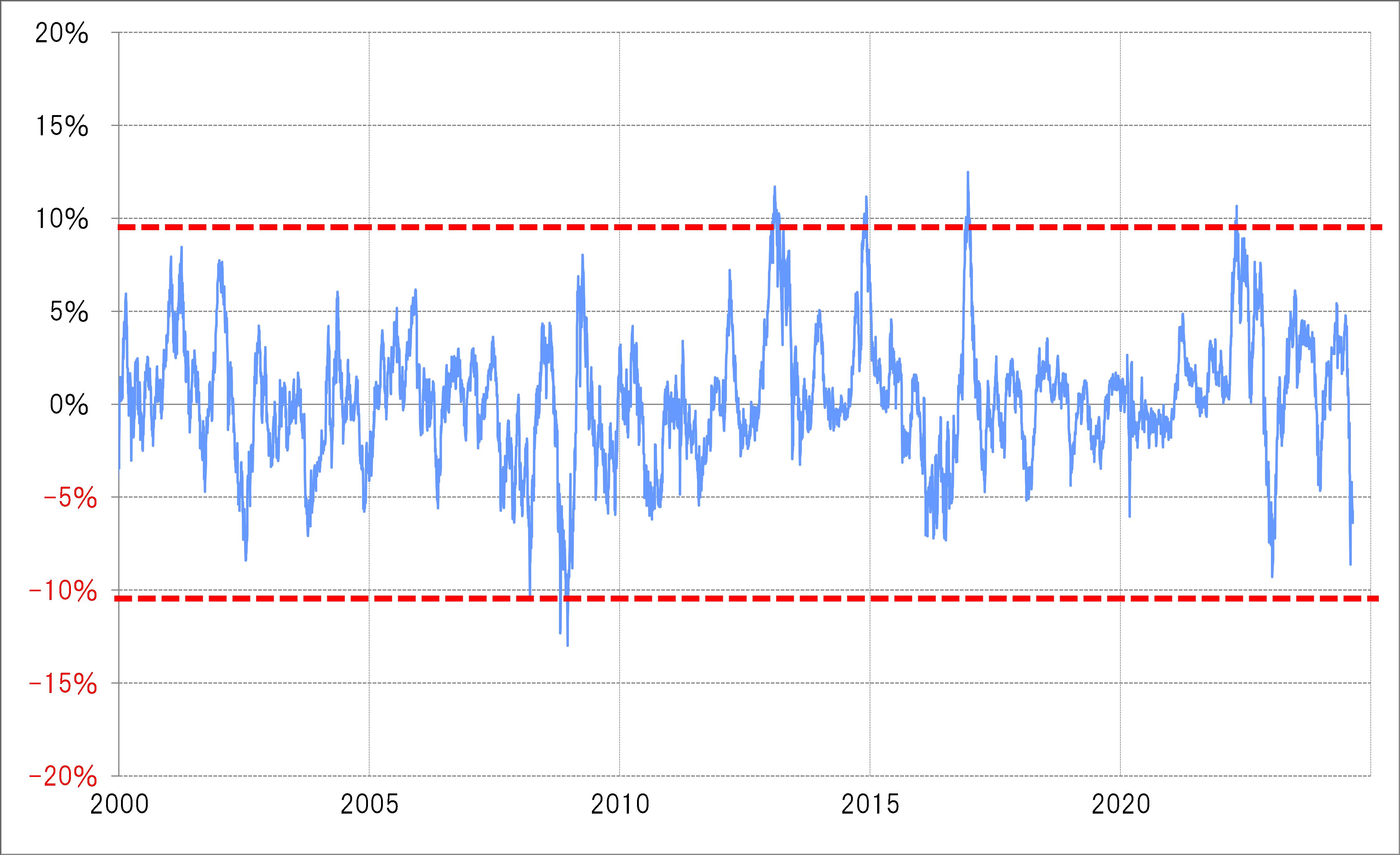 その後、米ドル/円が149円台まで反発するなかで、短期的な「下がり過ぎ」も修正されましたが、90日MAかい離率は、足下でもマイナス6%程度で推移しており、「下がり過ぎ」気味の状況は、なお変わっていないといえそうです。