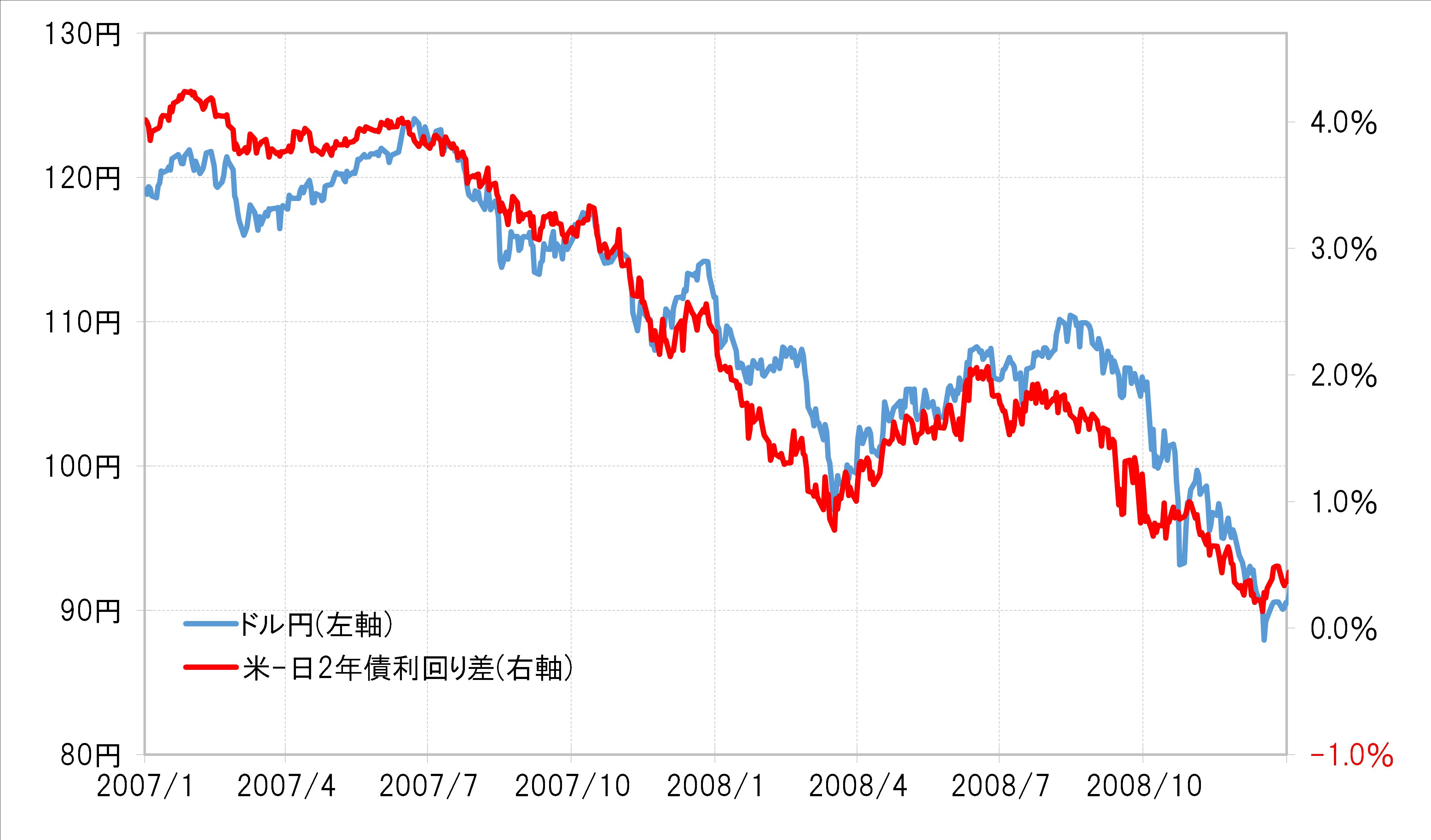 この日米金利差は、金融政策を反映する2年債利回り差米ドル優位で見ると、7月初めの4.4%程度から一時は3.4%程度まで、つまり約1%といった具合に、比較的大きく縮小しました。