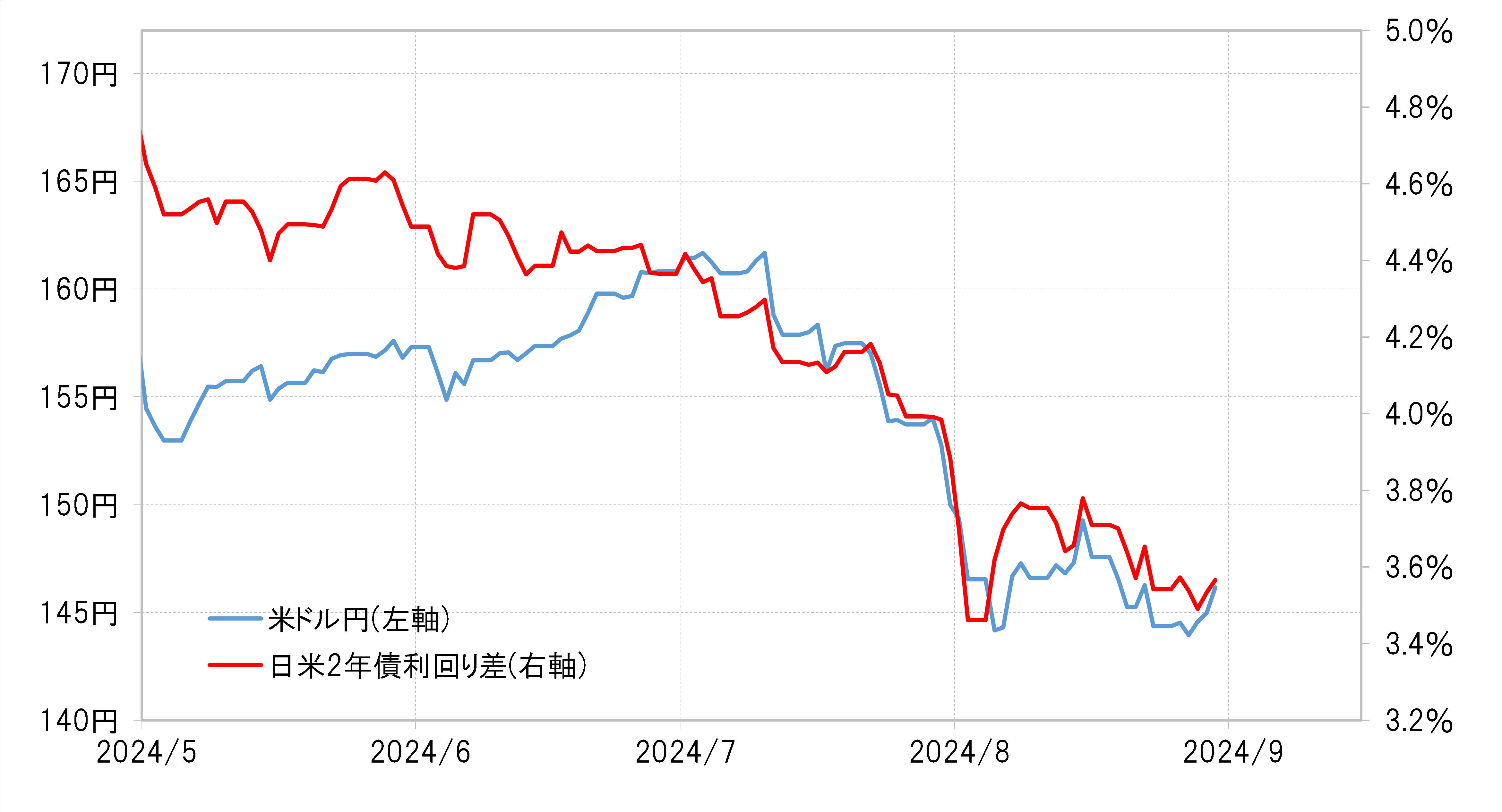 7~8月に、日銀は利上げを実施し、一方、FRB(米連邦準備制度理事会)の金融政策変更はありませんでした。ただし、市場金利は、米利下げを先取りした米金利低下が、日本の金利上昇以上に、日米金利差変化に大きく影響したといえます。