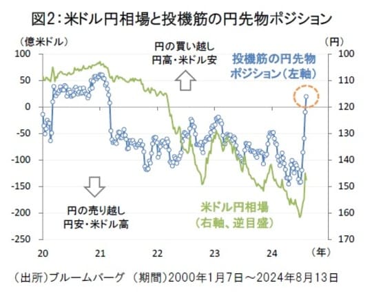 もっとも、①8月7日に日銀の内田副総裁が今後の利上げへのハト派的な慎重姿勢を示したことや、②最新の投機筋の円先物ポジション(図2)において円キャリートレードの巻き戻しが概ね一巡しつつあることが示されたこと(8月13日時点の投機筋の円先物ポジションは2021年3月以来の円の買い越しに転換)などから、日本株や米ドル円相場を巡る市場環境は落ち着きを取り戻し始めています。