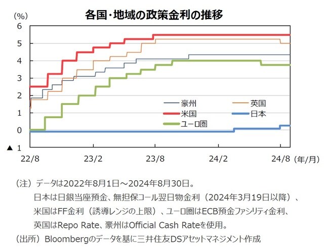 ●FRBは7月末の米連邦公開市場委員会(FOMC)で、政策金利(フェデラルファンド〔FF〕金利5.25~5.50%)を8会合連続で据え置きました。パウエル議長は8月に行われた経済シンポジウム「ジャクソンホール会議」の講演で、次回9月のFOMCでの利下げを強く示唆しました。