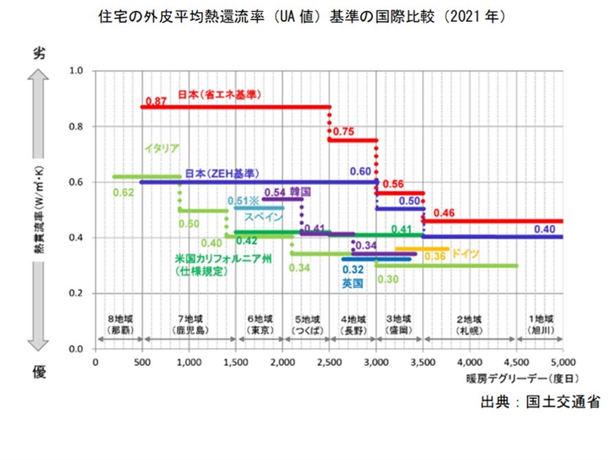 【図表1】は、住宅の断熱性能の指標である外皮平均熱貫流率(UA値)の基準の国際比較です。縦軸は、各国は住宅の断熱性能の基準を示しています。値が小さいほど高断熱であることを意味します。