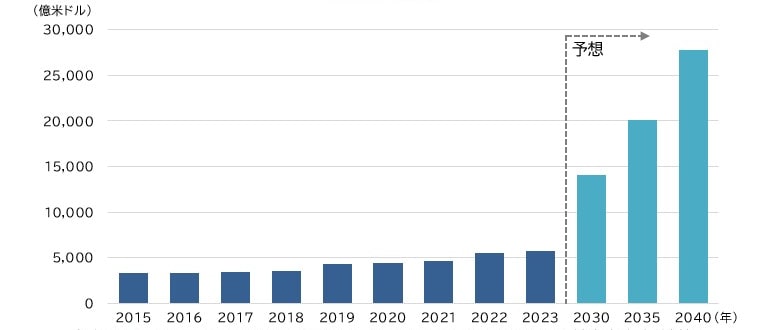 ※世界の宇宙ビジネスは、人工衛星の製造・運用に加え、地球の観測事業、テレビ・ラジオ・携帯通信・高速通信サービスなどの人工衛星を利用したサービスが含まれます。なお2030年以降は、超音速飛行ビジネスの市場規模(売上高)を含みます。