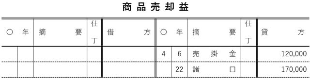 4月6日、秋田商店に原価300,000円の商品を420,000円で販売し、代金は掛けとしました。借方・売掛金42万円、貸方・商品25万円と商品売買益12万円です。