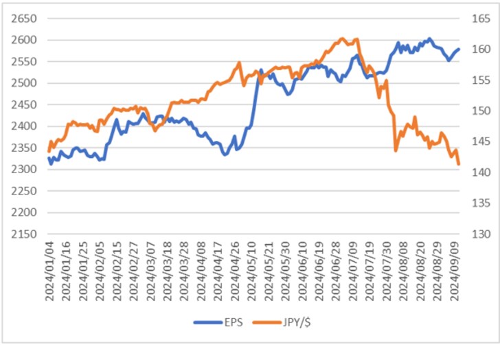 まとめると、円高で外需産業は業績の下方修正が起きているが、それを上回るペースで内需企業の業績が上方修正され、日本株全体ではしっかりとEPS成長が維持されている。