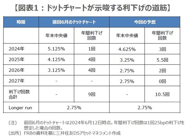 FOMC声明では、利下げ決定の背景として、インフレの一段の鈍化と、雇用情勢悪化のリスクが指摘されるとみています。ドットチャートでは、メンバーが適切と考える25bpの利下げ回数について、2024年1回から3回、2025年は4回から5.5回、2026年は4回から2回に修正され、新たに示される2027年は0回、「Longer run」(景気を熱しも冷やしもしない「中立金利」を意味する長期のFF金利水準)は2.75%で不変と予想します(図表1)。