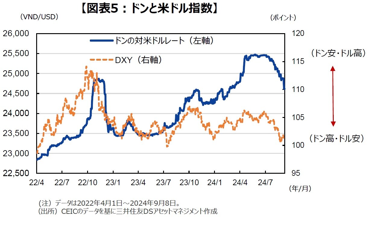 ●米国の利下げ観測の高まりを契機に6月下旬以降、米ドル指数(DXY)は下落傾向にあります。今後米国の利下げが続くと想定すれば、米ドルは更に下落する可能性があり、ベトナムドンの対米ドルレートには上昇余地があるとみられます。